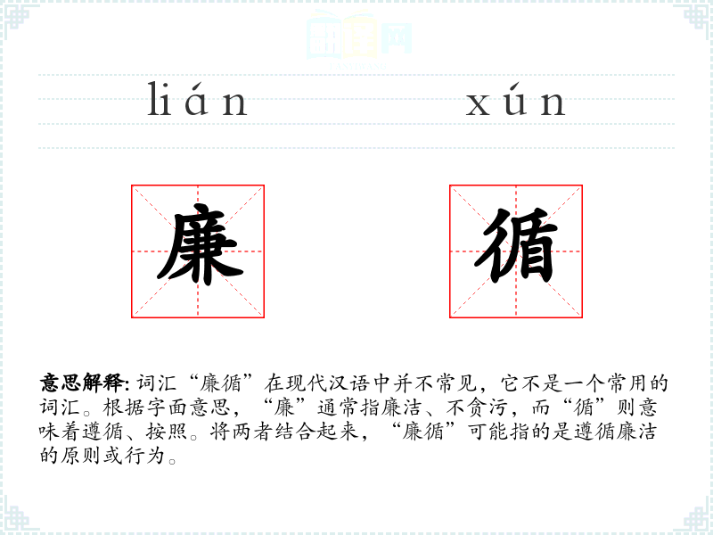 词汇“廉循”在现代汉语中并不常见,它不是一个常用的词汇。根据字面意思,“廉”通常指廉洁、不贪污,而“循”则意味着遵循、按照。将两者结合起来,“廉循”可能指的是遵循廉洁的原则或行为。