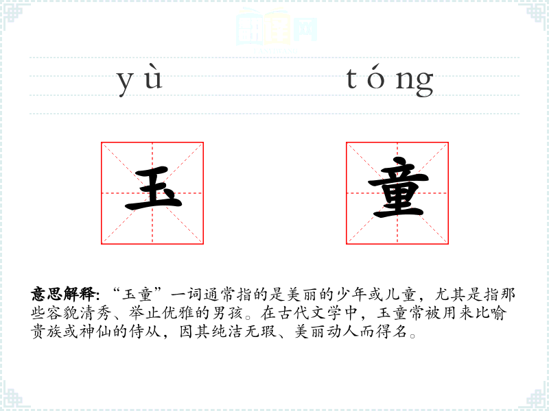 “玉童”一词通常指的是美丽的少年或儿童,尤其是指那些容貌清秀、举止优雅的男孩。在古代文学中,玉童常被用来比喻贵族或神仙的侍从,因其纯洁无瑕、美丽动人而得名。