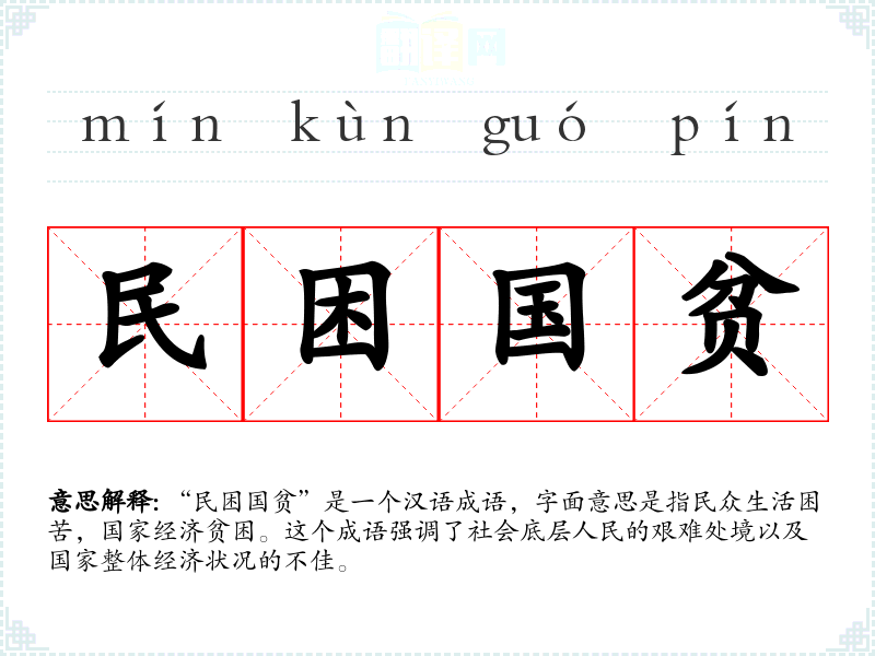 “民困国贫”是一个汉语成语,字面意思是指民众生活困苦,国家经济贫困。这个成语强调了社会底层人民的艰难处境以及国家整体经济状况的不佳。