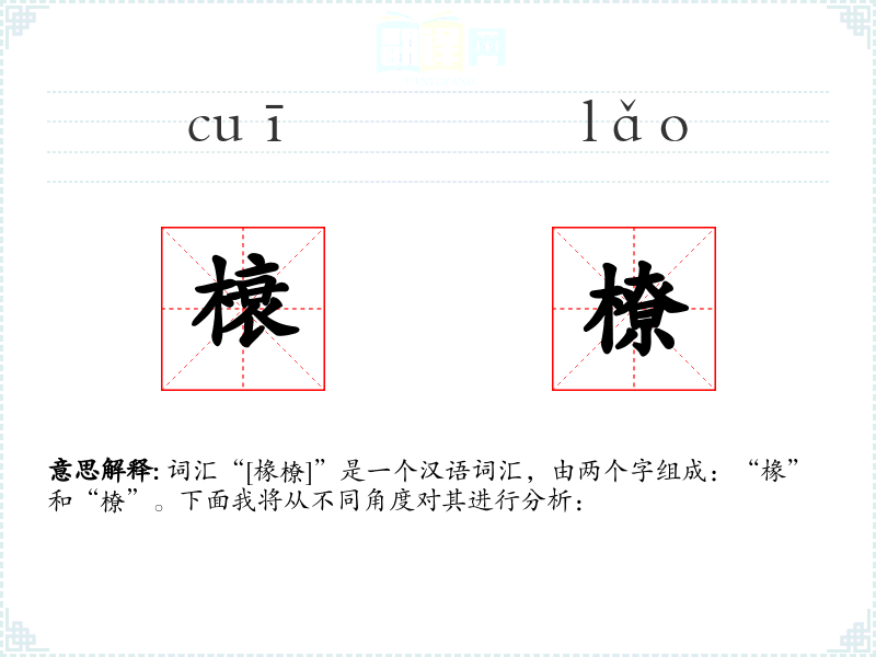 词汇“[椽橑]”是一个汉语词汇,由两个字组成:“椽”和“橑”。下面我将从不同角度对其进行分析: