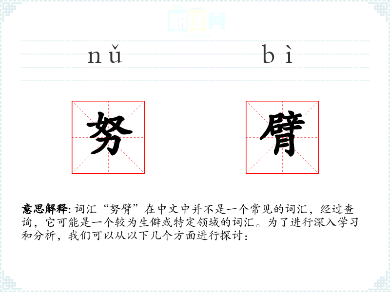 词汇“努臂”在中文中并不是一个常见的词汇,经过查询,它可能是一个较为生僻或特定领域的词汇。为了进行深入学*和分析,我们可以从以下几个方面进行探讨: