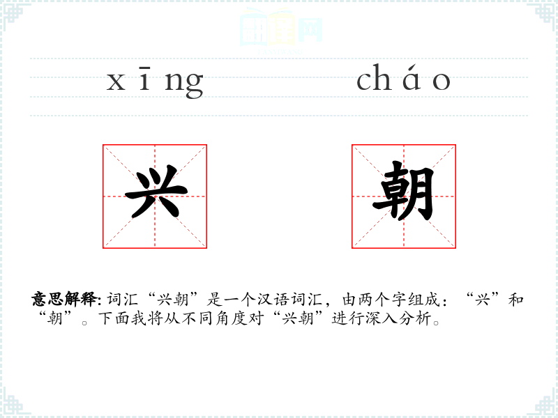 - 词源:“兴”和“朝”都是古代汉语中的常用字,组合起来形成了一个描述历史时期的词汇。