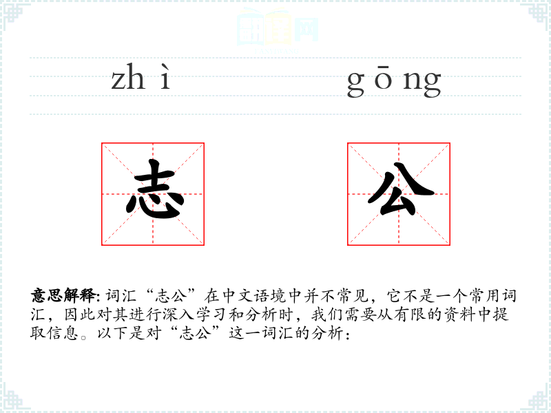 词汇“志公”在中文语境中并不常见,它不是一个常用词汇,因此对其进行深入学*和分析时,我们需要从有限的资料中提取信息。以下是对“志公”这一词汇的分析: