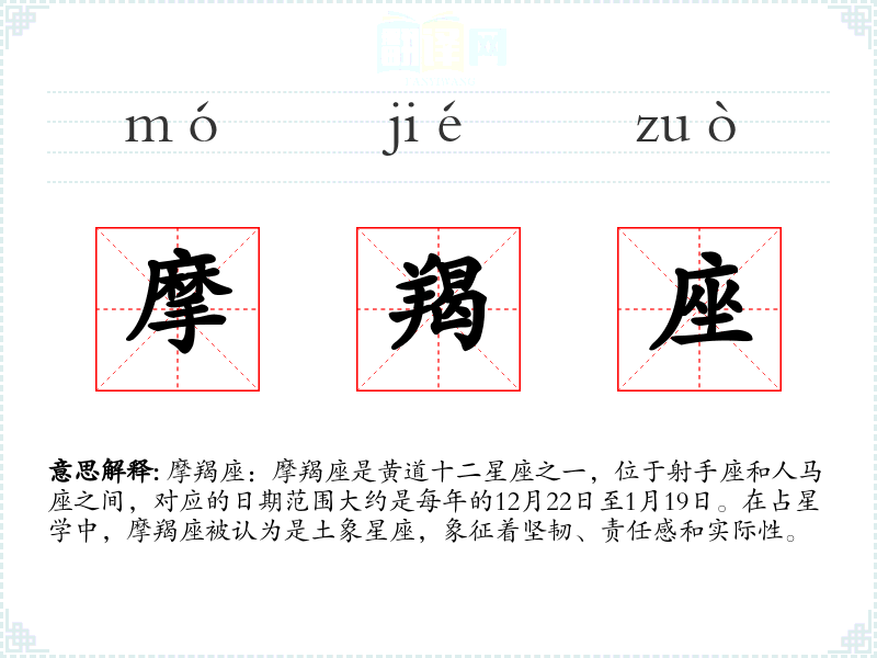 摩羯座:摩羯座是黄道十二星座之一,位于射手座和人马座之间,对应的日期范围大约是每年的12月22日至1月19日。在占星学中,摩羯座被认为是土象星座,象征着坚韧、责任感和实际性。
