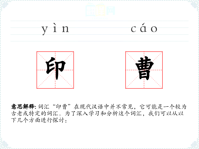词汇“印曹”在现代汉语中并不常见,它可能是一个较为古老或特定的词汇。为了深入学*和分析这个词汇,我们可以从以下几个方面进行探讨: