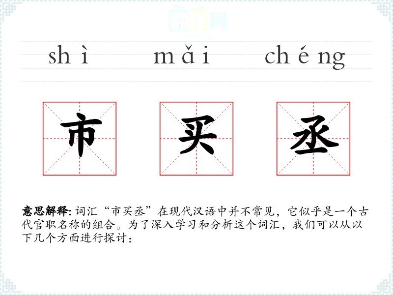 词汇“市买丞”在现代汉语中并不常见,它似乎是一个古代官职名称的组合。为了深入学习和分析这个词汇,我们可以从以下几个方面进行探讨: