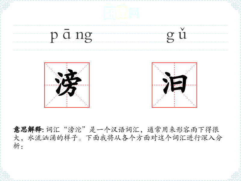 词汇“滂沱”是一个汉语词汇,通常用来形容雨下得很大,水流汹涌的样子。下面我将从各个方面对这个词汇进行深入分析: