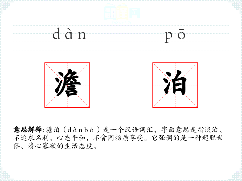 澹泊(dàn bó)是一个汉语词汇,字面意思是指淡泊、不追求名利,心态平和,不贪图物质享受。它强调的是一种超脱世俗、清心寡欲的生活态度。