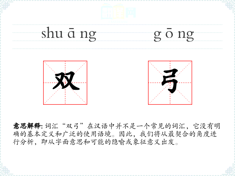 “双弓”作为一个组合词,由“双”和“弓”组成。在汉语中,“双”表示两个,而“弓”有其传统的意义。这个词没有明显的历史演变,因为它不是一个常用词汇。