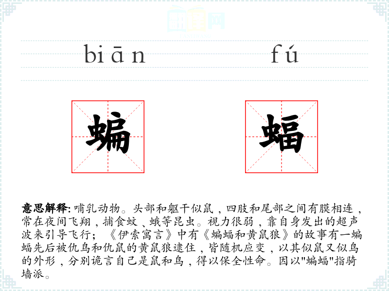 1.哺乳动物。头部和躯干似鼠﹐四肢和尾部之间有膜相连﹐常在夜间飞翔﹐捕食蚊﹑蛾等昆虫。视力很弱﹐靠自身发出的超声波来引导飞行; 《伊索寓言》中有《蝙蝠和黄鼠狼》的故事有一蝙蝠先后被仇鸟和仇鼠的黄鼠狼逮住﹐皆随机应变﹐以其似鼠又似鸟的外形﹐分别诡言自己是鼠和鸟﹐得以保全性命。因以"蝙蝠"指骑墙派。