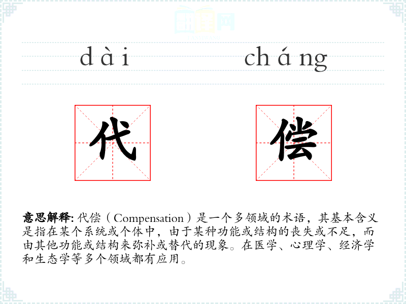 在不同语言中,代偿的概念有相应的词汇,如英语中的“compensation”,德语中的“Kompensation”,虽然具体用法和语境可能有所不同,但核心概念相似。