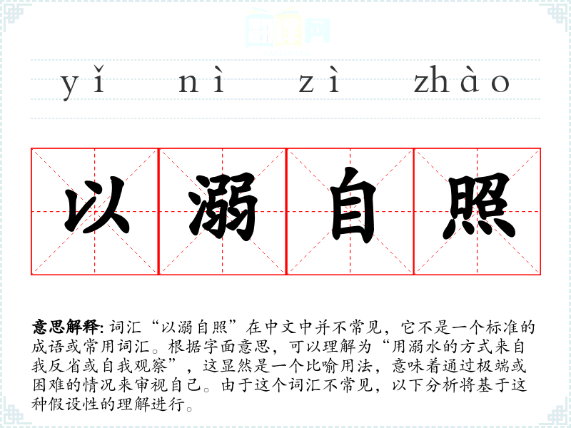 词汇“以溺自照”在中文中并不常见,它不是一个标准的成语或常用词汇。根据字面意思,可以理解为“用溺水的方式来自我反省或自我观察”,这显然是一个比喻用法,意味着通过极端或困难的情况来审视自己。由于这个词汇不常见,以下分析将基于这种假设性的理解进行。