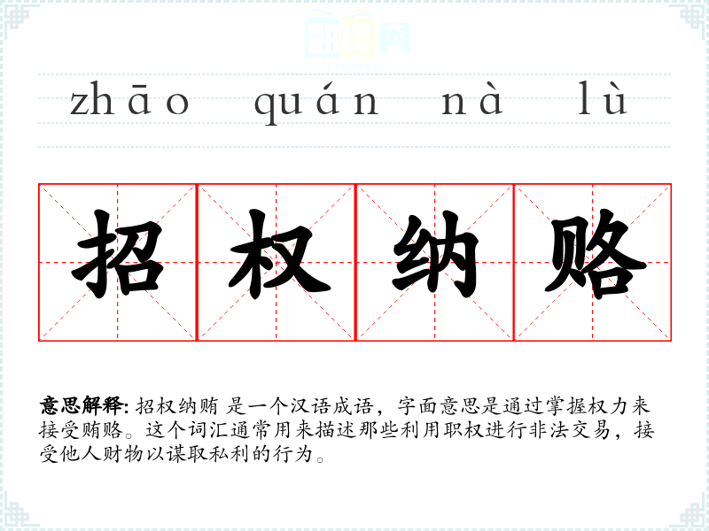 招权纳贿 是一个汉语成语,字面意思是通过掌握权力来接受贿赂。这个词汇通常用来描述那些利用职权进行非法交易,接受他人财物以谋取私利的行为。