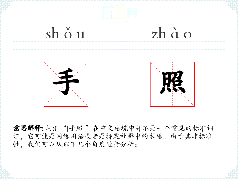 词汇“[手照]”在中文语境中并不是一个常见的标准词汇,它可能是网络用语或者是特定社群中的术语。由于其非标准性,我们可以从以下几个角度进行分析:
