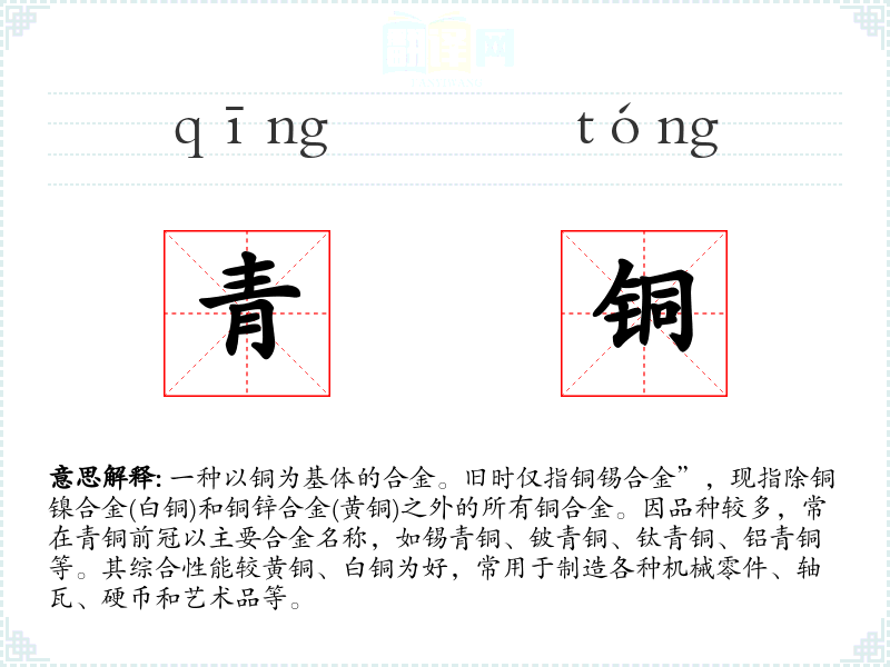 1.一种以铜为基体的合金。旧时仅指铜锡合金”,现指除铜镍合金(白铜)和铜锌合金(黄铜)之外的所有铜合金。因品种较多,常在青铜前冠以主要合金名称,如锡青铜、铍青铜、钛青铜、铝青铜等。其综合性能较黄铜、白铜为好,常用于制造各种机械零件、轴瓦、硬币和艺术品等。