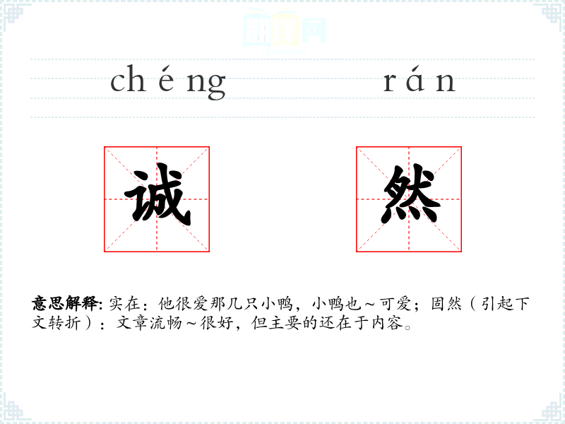 实在:他很爱那几只小鸭,小鸭也~可爱;固然(引起下文转折):文章流畅~很好,但主要的还在于内容。