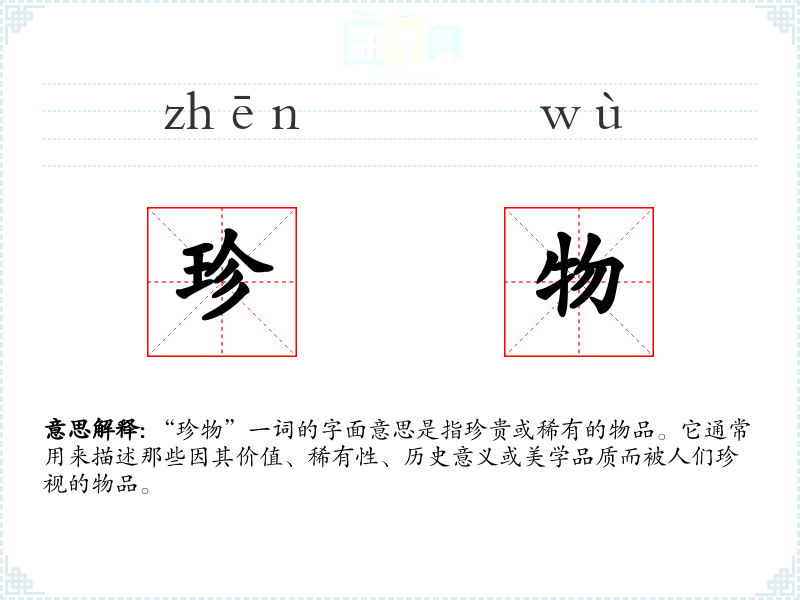 “珍物”一词的字面意思是指珍贵或稀有的物品。它通常用来描述那些因其价值、稀有性、历史意义或美学品质而被人们珍视的物品。