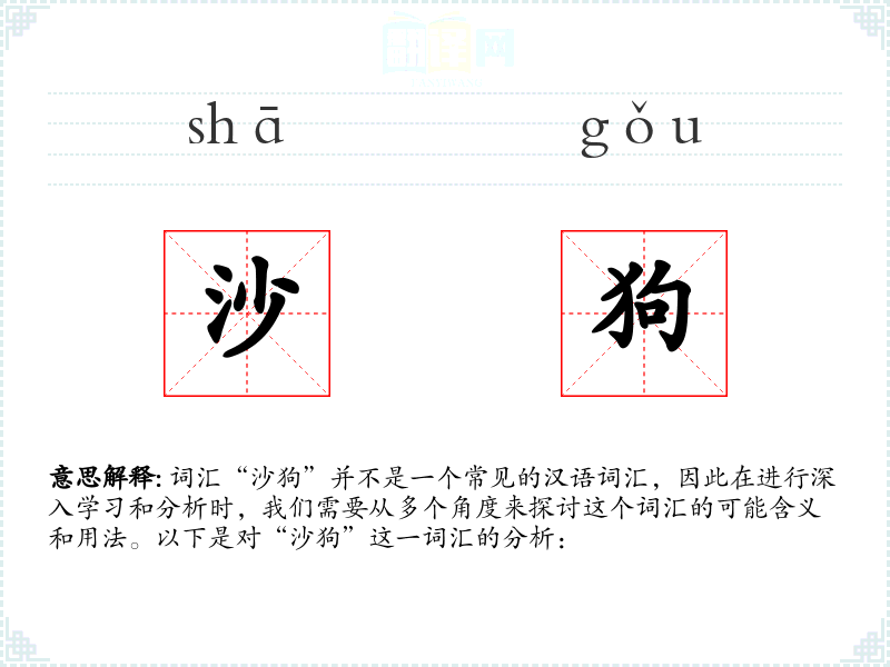 “沙狗”这个词汇在字面上可以理解为“沙子中的狗”或“像沙子一样的狗”。然而,在现代汉语中,这个词汇并没有明确的定义,可能是一个方言词汇、网络新词或者是特定领域的术语。