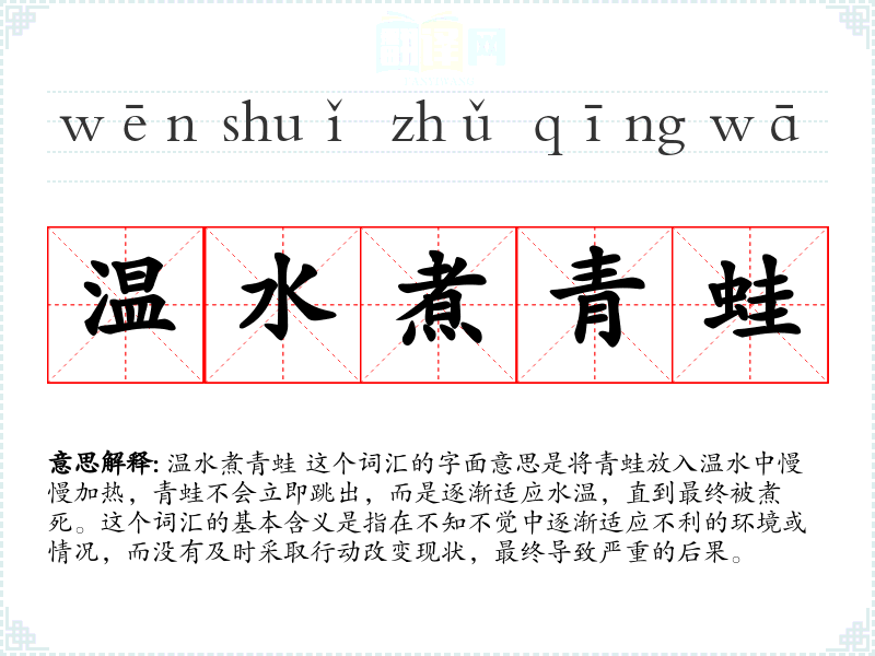 温水煮青蛙 这个词汇的字面意思是将青蛙放入温水中慢慢加热,青蛙不会立即跳出,而是逐渐适应水温,直到最终被煮死。这个词汇的基本含义是指在不知不觉中逐渐适应不利的环境或情况,而没有及时采取行动改变现状,最终导致严重的后果。