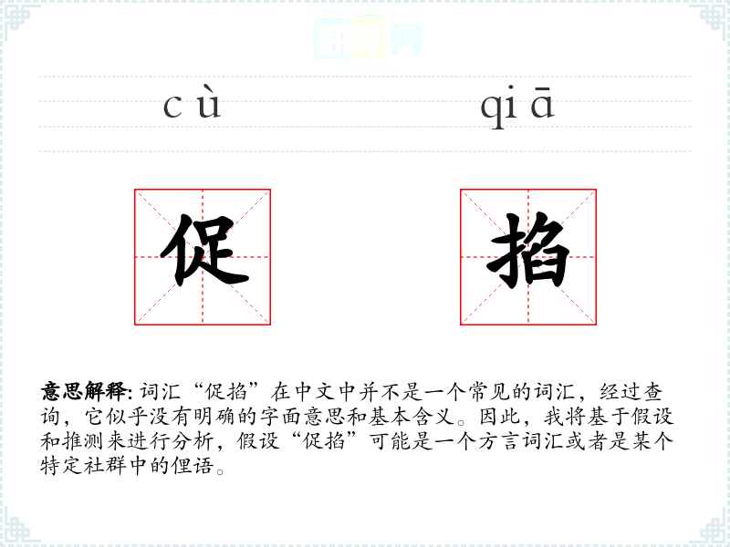 由于“促掐”不是一个标准汉语词汇,我们无法提供一个确切的基本定义。如果它是一个方言词汇,那么它的意思可能会根据地区的不同而有所变化。
