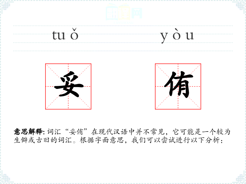 词汇“妥侑”在现代汉语中并不常见,它可能是一个较为生僻或古旧的词汇。根据字面意思,我们可以尝试进行以下分析: