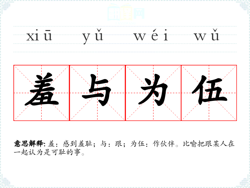 羞:感到羞耻;与:跟;为伍:作伙伴。比喻把跟某人在一起认为是可耻的事。