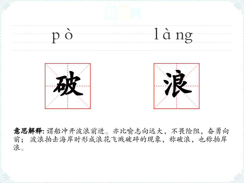 谓船冲开波浪前进。亦比喻志向远大,不畏险阻,奋勇向前; 波浪拍击海岸时形成浪花飞溅破碎的现象,称破浪,也称拍岸浪。