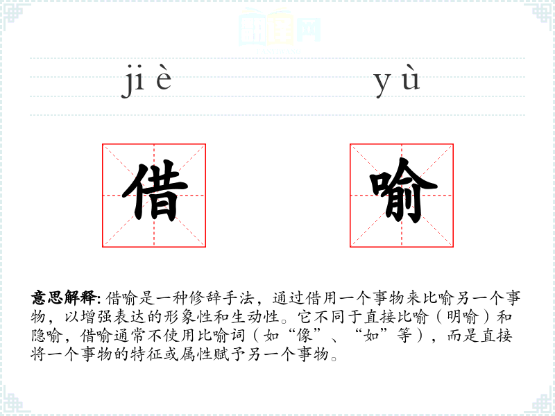 同义词:隐喻、象征、比喻 反义词:直述、明喻