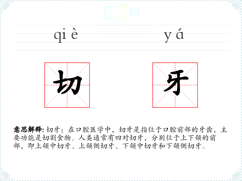 “切牙”一词源自汉语,直接反映了其功能——切割食物。在古代汉语中,类似的词汇可能更侧重于描述牙齿的形状和功能,而现代汉语则更多地将其作为一个专业术语使用。