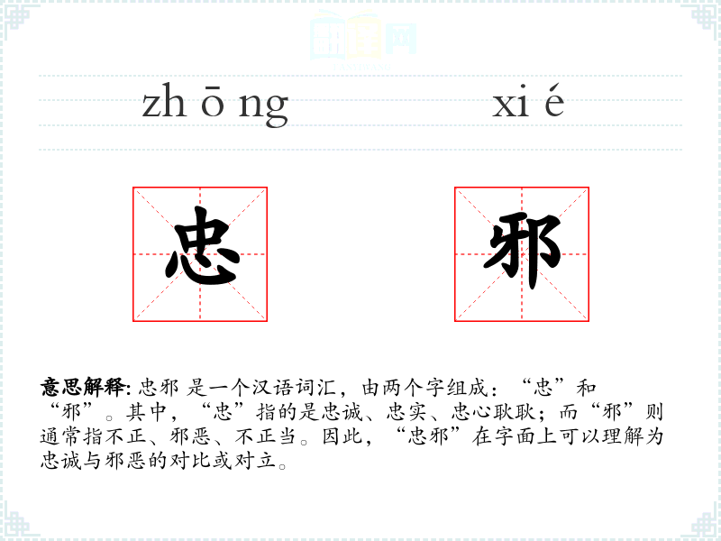“忠”字最早见于甲骨文,原意为心中无私,后引申为忠诚不二。“邪”字则源于古代对不正之风的描述,后泛指一切不正当的事物。在古代文献中,“忠邪”常并提,用以区分正邪两道。