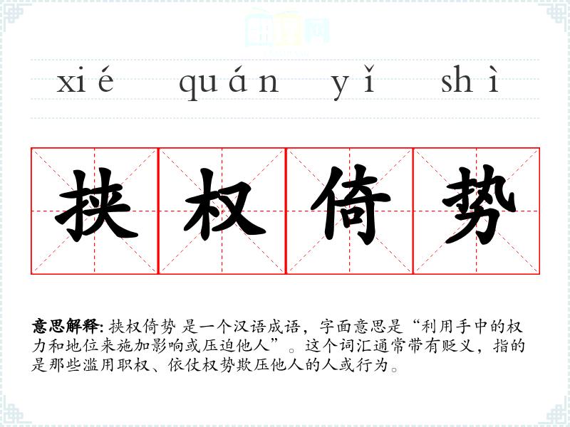 挟权倚势 是一个汉语成语,字面意思是“利用手中的权力和地位来施加影响或压迫他人”。这个词汇通常带有贬义,指的是那些滥用职权、依仗权势欺压他人的人或行为。