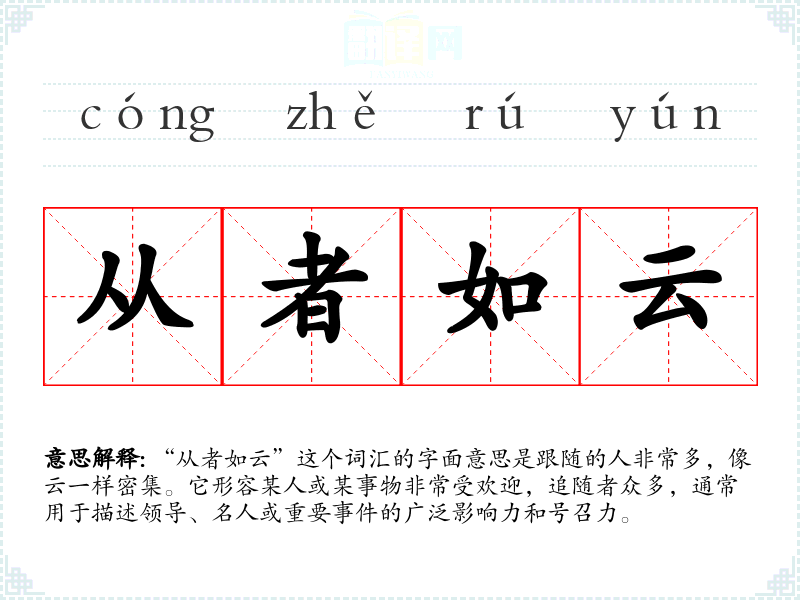 “从者如云”这个词汇的字面意思是跟随的人非常多,像云一样密集。它形容某人或某事物非常受欢迎,追随者众多,通常用于描述领导、名人或重要**的广泛影响力和号召力。