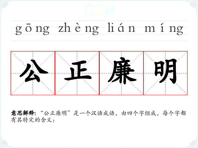 “公正廉明”是一个汉语成语,由四个字组成,每个字都有其特定的含义: