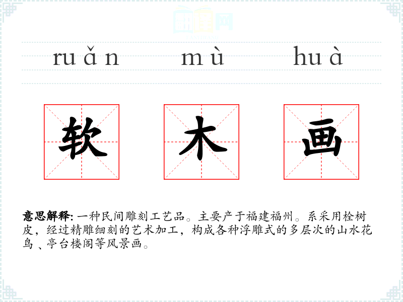 一种民间雕刻工艺品。主要产于福建福州。系采用栓树皮,经过