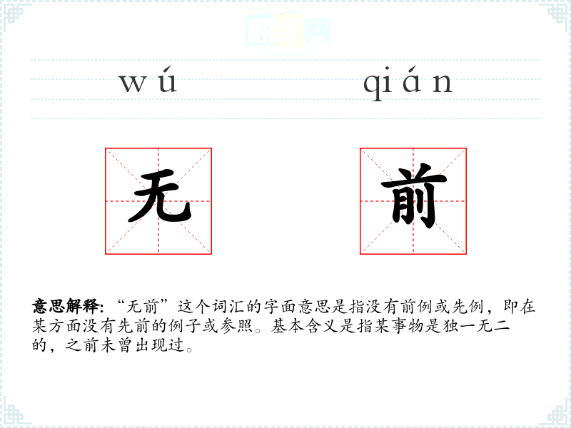 “无前”这个词汇的字面意思是指没有前例或先例,即在某方面没有先前的例子或参照。基本含义是指某事物是独一无二的,之前未曾出现过。