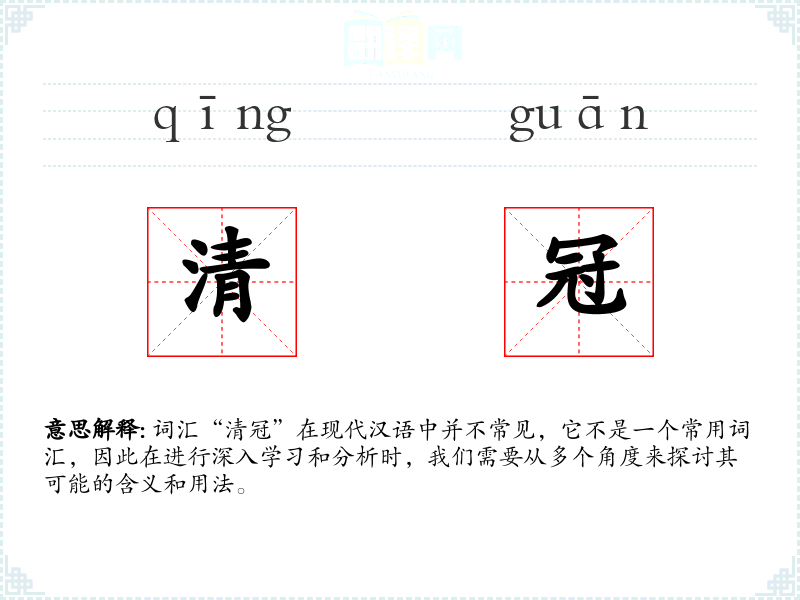 词汇“清冠”在现代汉语中并不常见,它不是一个常用词汇,因此在进行深入学*和分析时,我们需要从多个角度来探讨其可能的含义和用法。