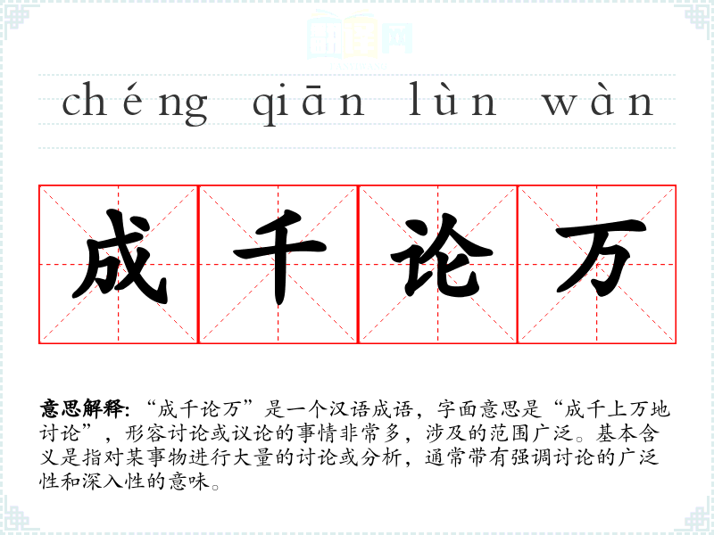 “成千论万”是一个汉语成语,字面意思是“成千上万地讨论”,形容讨论或议论的事情非常多,涉及的范围广泛。基本含义是指对某事物进行大量的讨论或分析,通常带有强调讨论的广泛性和深入性的意味。
