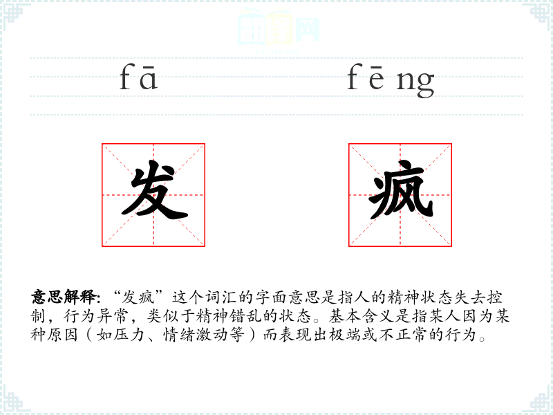 “发疯”这个词汇的词源较为直接,由“发”(表示动作的开始或进行)和“疯”(指精神错乱)组成。在古代汉语中,“疯”已有指代精神错乱的含义,而“发”则加强了这种状态的突发性和动态性。