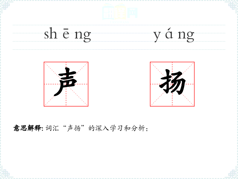“声扬”由“声”和“扬”两个字组成,其中“声”指声音,“扬”指上升或传播。这个词汇在中文中的使用历史悠久,但其具体词源和演变过程需要进一步的语言学研究来确定。