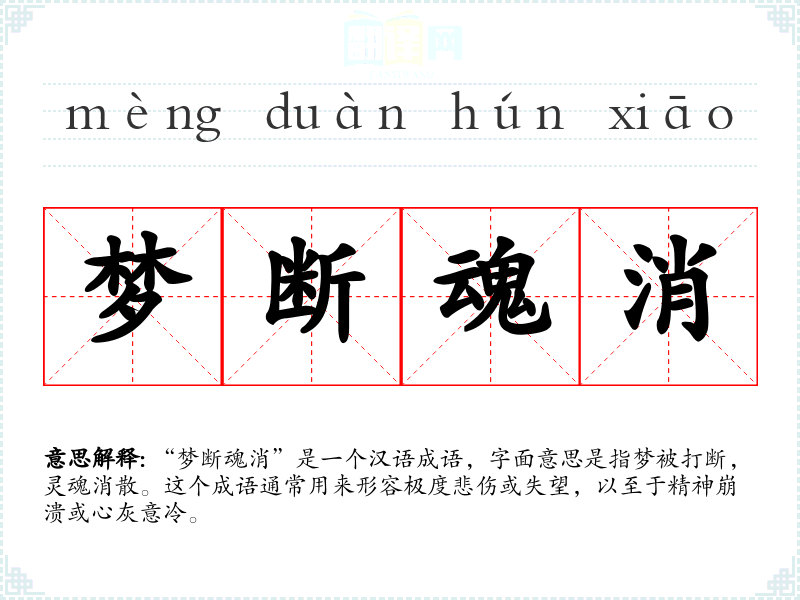 “梦断魂消”是一个汉语成语,字面意思是指梦被打断,灵魂消散。这个成语通常用来形容极度悲伤或失望,以至于精神崩溃或心灰意冷。