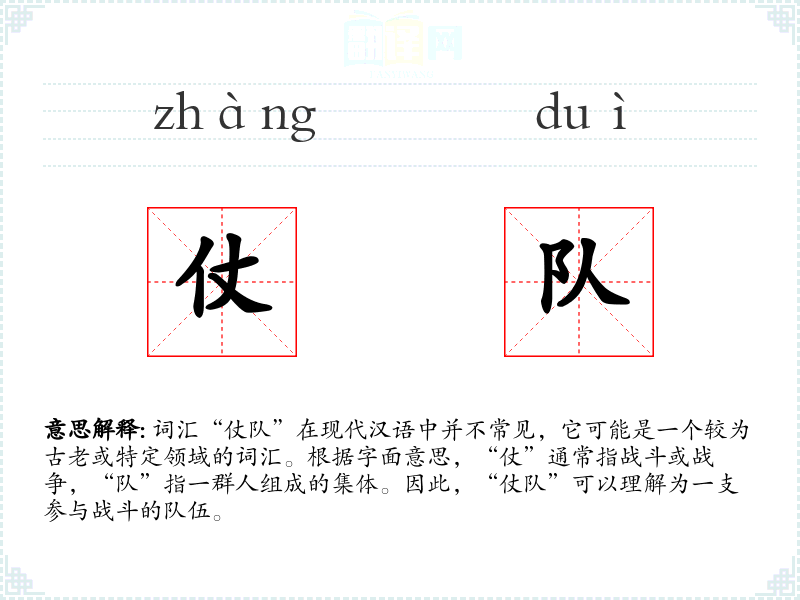词汇“仗队”在现代汉语中并不常见,它可能是一个较为古老或特定领域的词汇。根据字面意思,“仗”通常指战斗或战争,“队”指一群人组成的集体。因此,“仗队”可以理解为一支参与战斗的队伍。