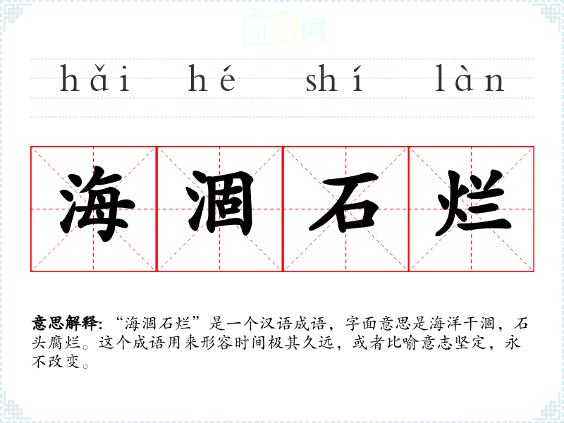 “海涸石烂”是一个汉语成语,字面意思是海洋干涸,石头腐烂。这个成语用来形容时间极其久远,或者比喻意志坚定,永不改变。