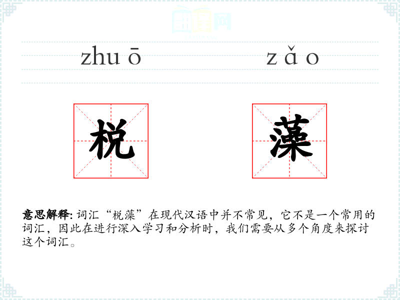 “棁藻”一词在现代汉语中并不常见,字典中也没有明确的定义。从字面上看,“棁”可能与“木”有关,而“藻”通常指水生植物,如藻类。因此,“棁藻”可能指的是某种与木和水生植物相关的事物,但具体含义不明确。