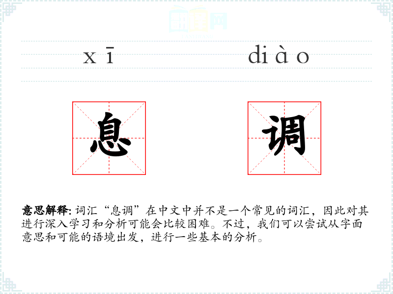词汇“息调”在中文中并不是一个常见的词汇,因此对其进行深入学习和分析可能会比较困难。不过,我们可以尝试从字面意思和可能的语境出发,进行一些基本的分析。