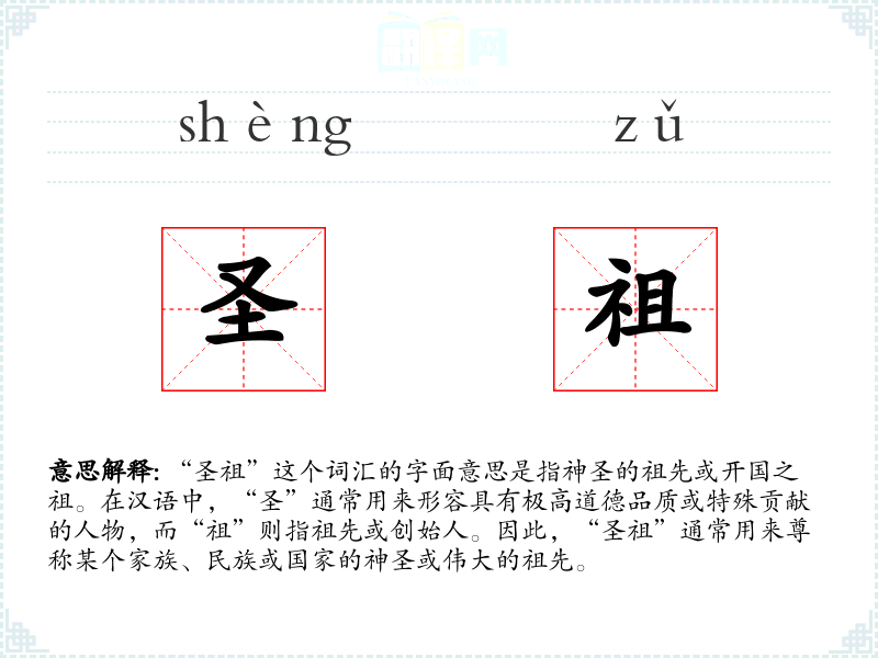 “圣祖”这个词汇的字面意思是指神圣的祖先或开国之祖。在汉语中,“圣”通常用来形容具有极高道德品质或特殊贡献的人物,而“祖”则指祖先或创始人。因此,“圣祖”通常用来尊称某个家族、民族或国家的神圣或伟大的祖先。