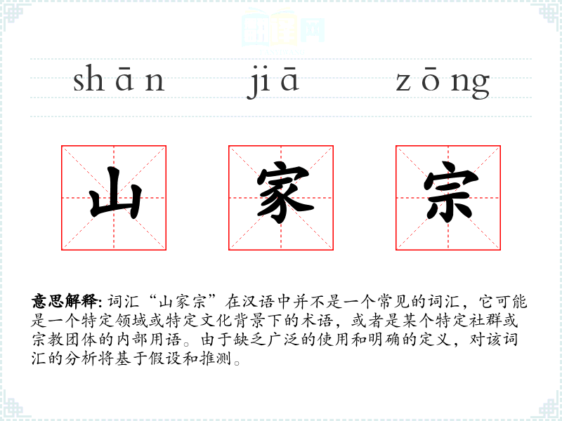 由于“山家宗”不是一个广泛使用的词汇,其词源和演变可能不为人所知。它可能是由“山”和“家宗”两个词组合而成,表示与山有关的家族或宗派。