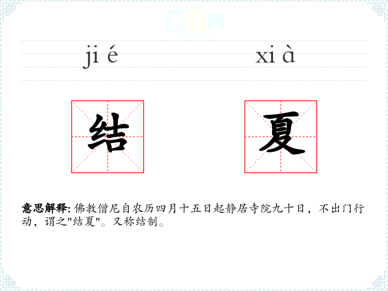 佛教僧尼自农历四月十五日起静居寺院九十日,不出门行动,谓之"结夏"。又称结制。