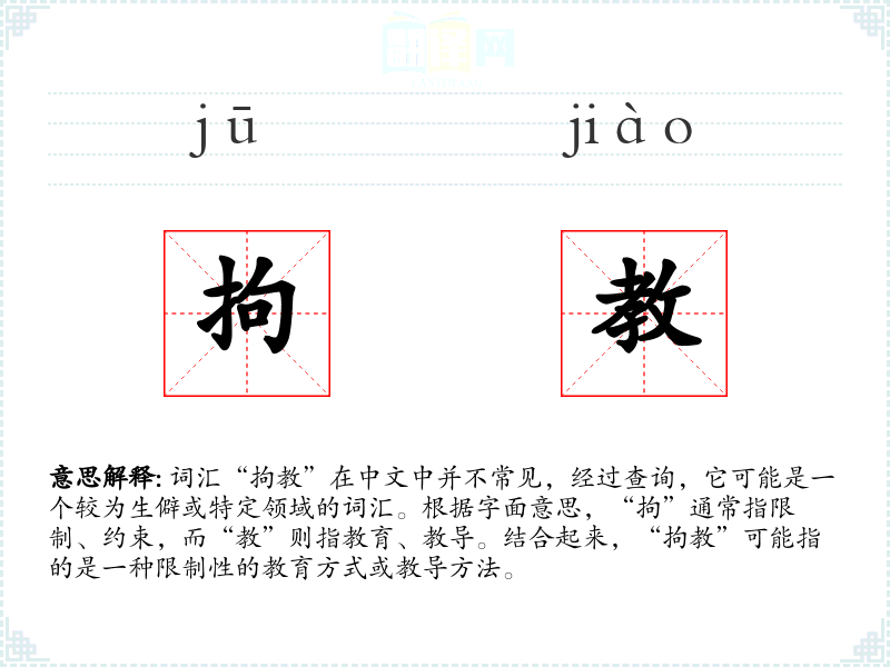词汇“拘教”在中文中并不常见,经过查询,它可能是一个较为生僻或特定领域的词汇。根据字面意思,“拘”通常指限制、约束,而“教”则指教育、教导。结合起来,“拘教”可能指的是一种限制性的教育方式或教导方法。