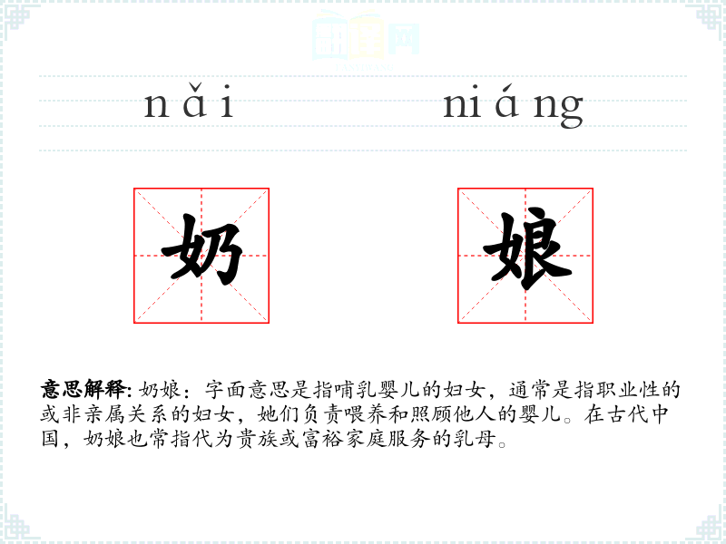 奶娘:字面意思是指哺乳婴儿的妇女,通常是指职业性的或非亲属关系的妇女,她们负责喂养和照顾他人的婴儿。在古代**,奶娘也常指代为贵族或富裕家庭服务的乳母。