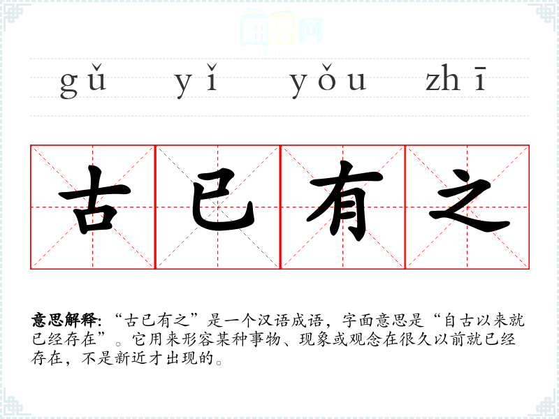 “古已有之”是一个汉语成语,字面意思是“自古以来就已经存在”。它用来形容某种事物、现象或观念在很久以前就已经存在,不是新近才出现的。